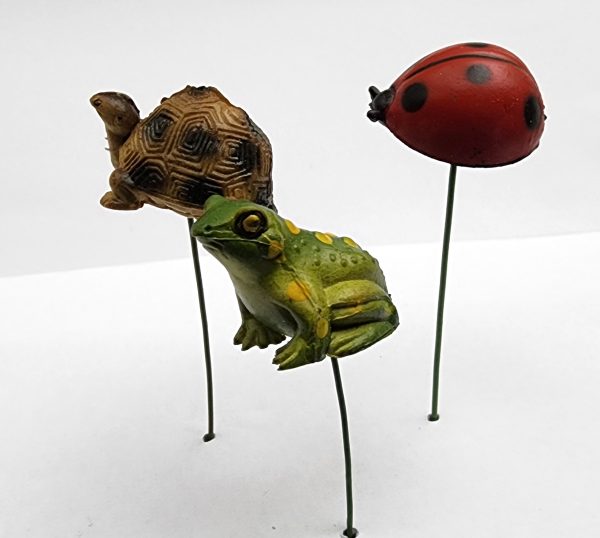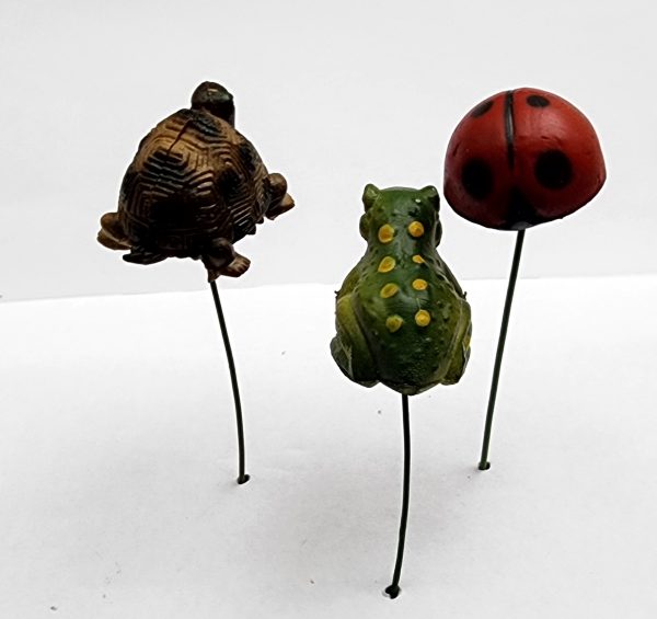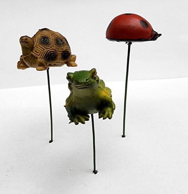 Frog, Turtle and Ladybug - 1 eachThese 1" critters are on a wire, but the wire is easy to remove (some are loose) - Great for fairy houses, mini gardens or just stick in a potted plant. They are like a rubbery plastic.1 set of each This Item is part of warehouse sale sectionNO RETURNS and is being sold as isAdditional information