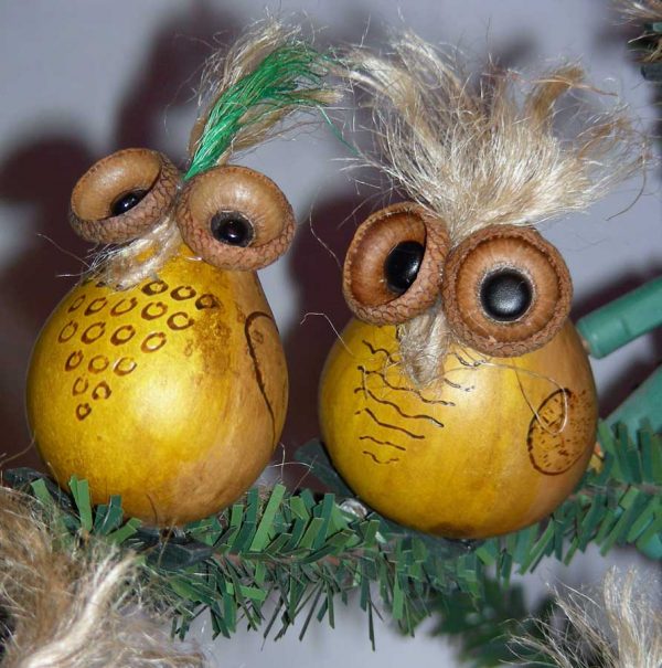 These adorable Owl ornaments are wood burned with a belly design and wings. Their eyes are from acorn caps and head and tail "feathers" are from natural fiber rope. They hang on to the tree with a mini clothespin.
