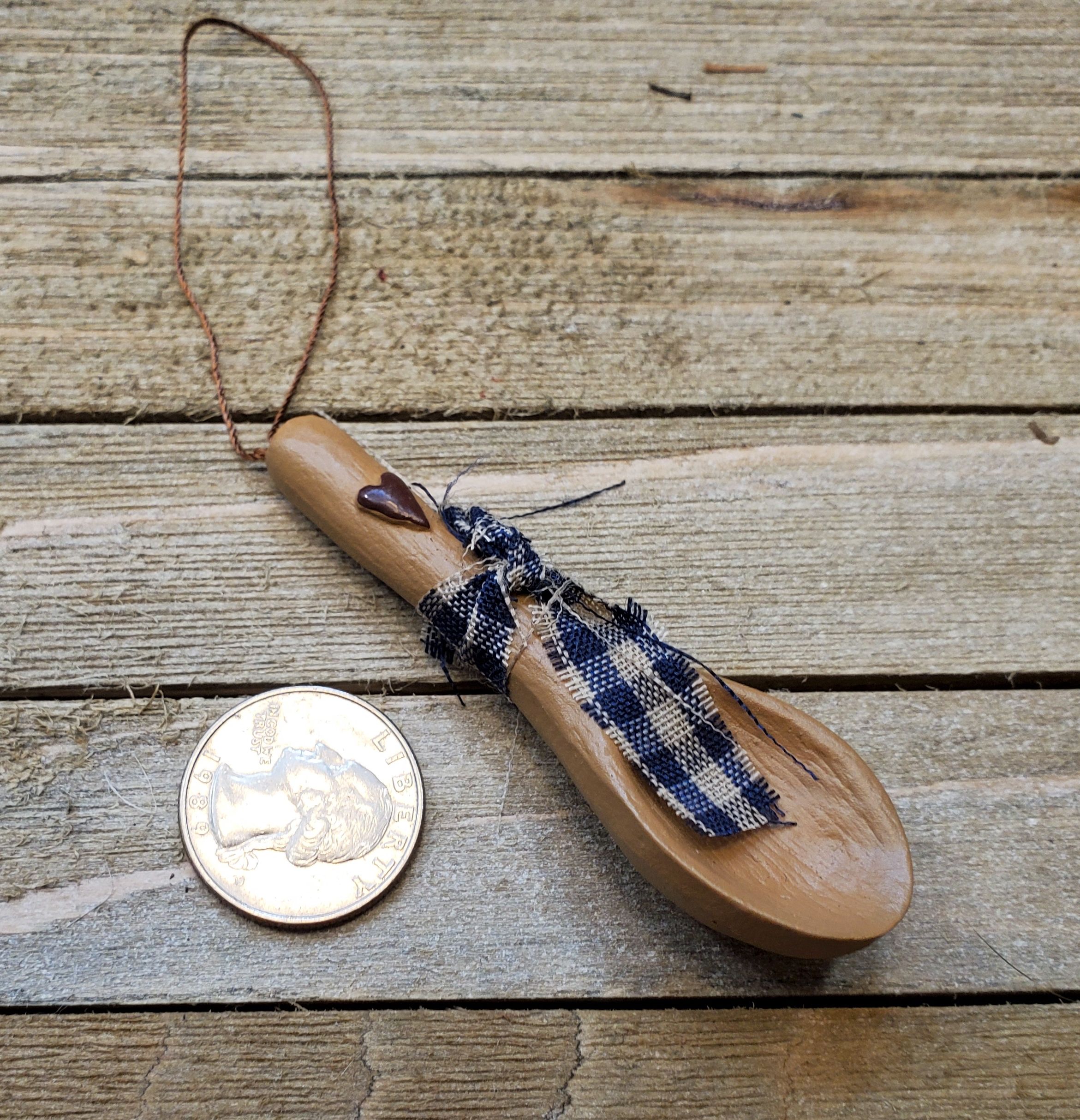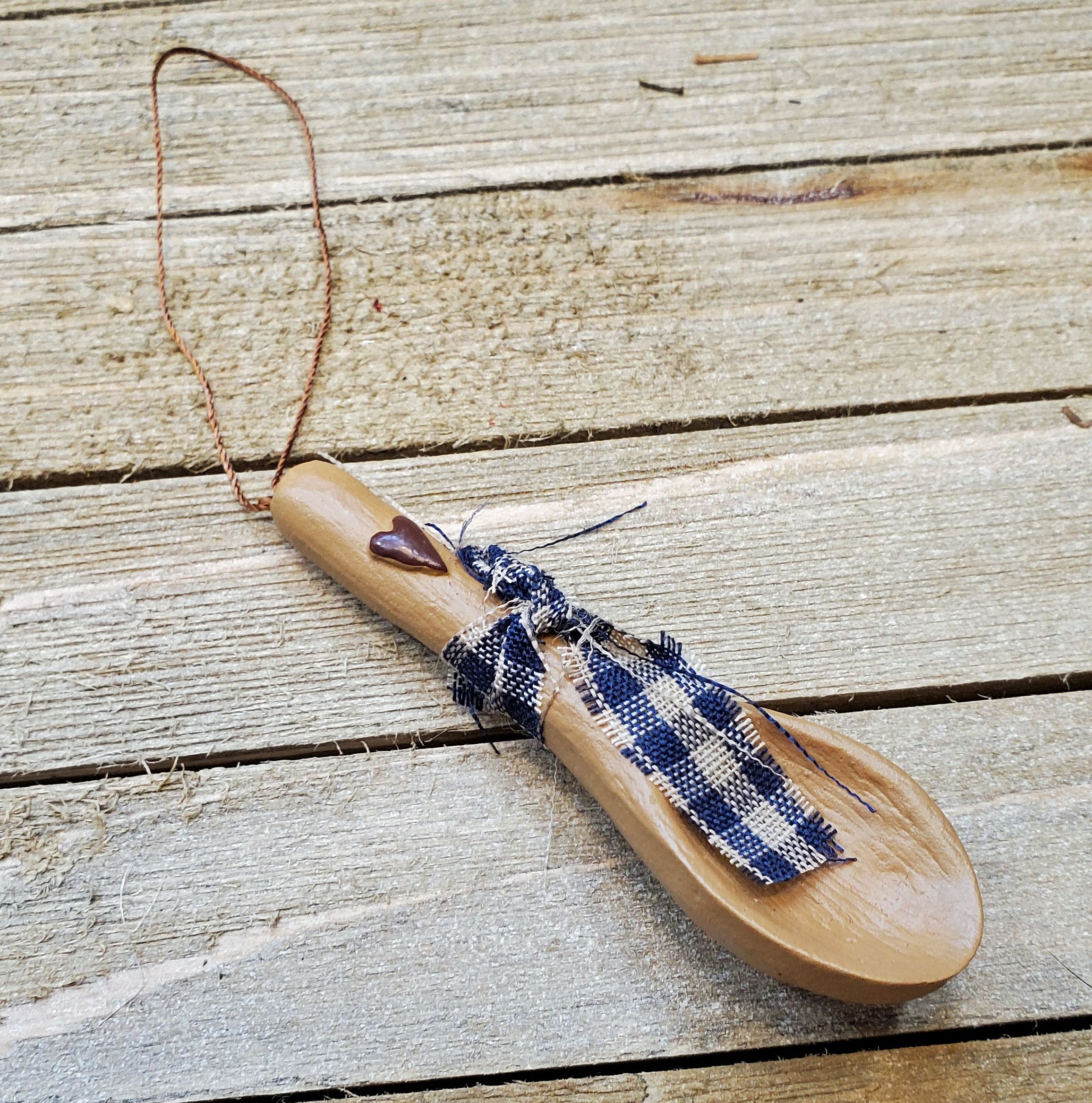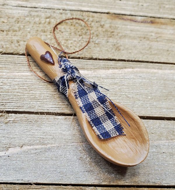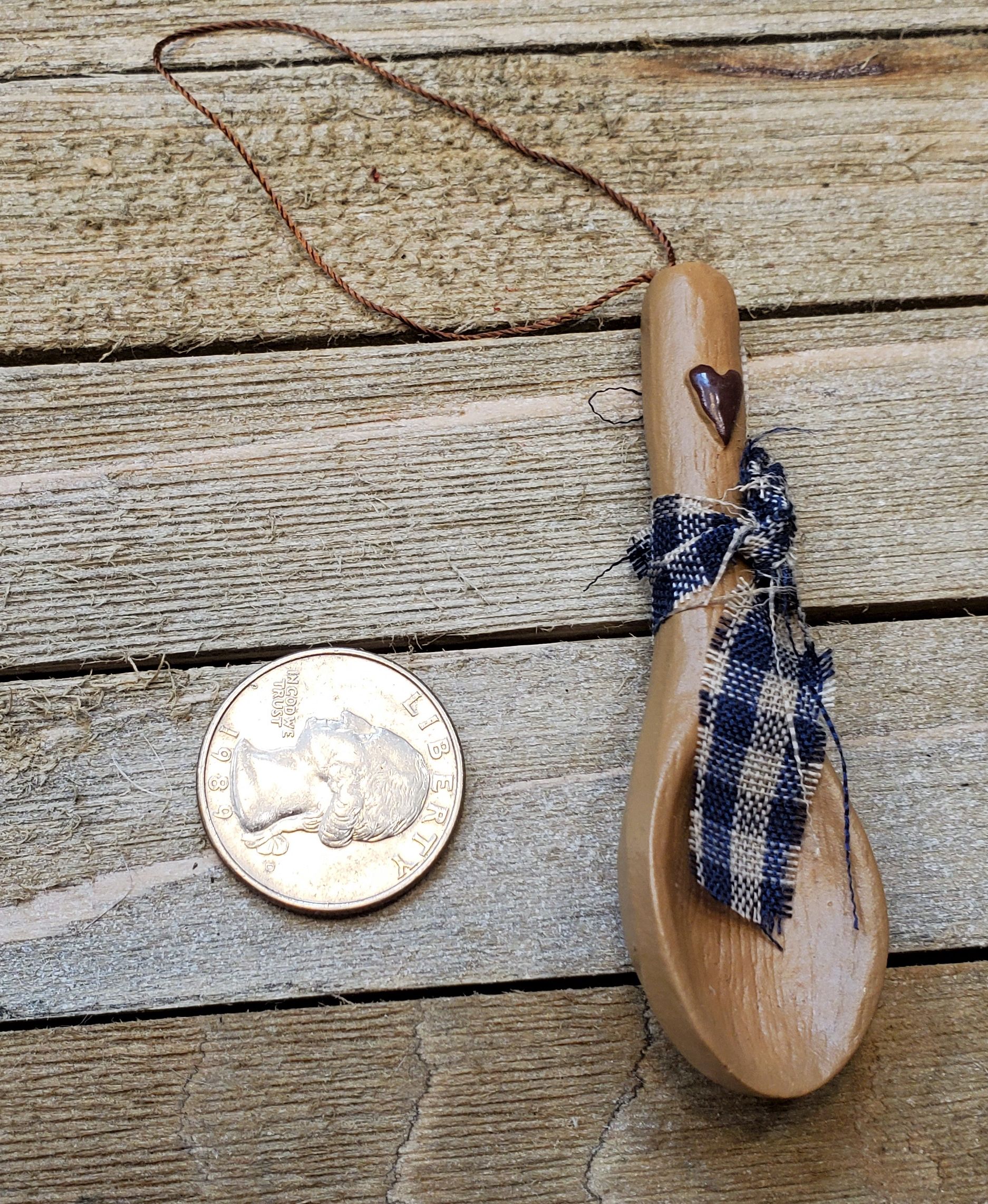 This adorable 3" spoon is a great addition to a basket, gourd or use as an ornament by itself. Comes with blue plaid ribbon, and has a red heart